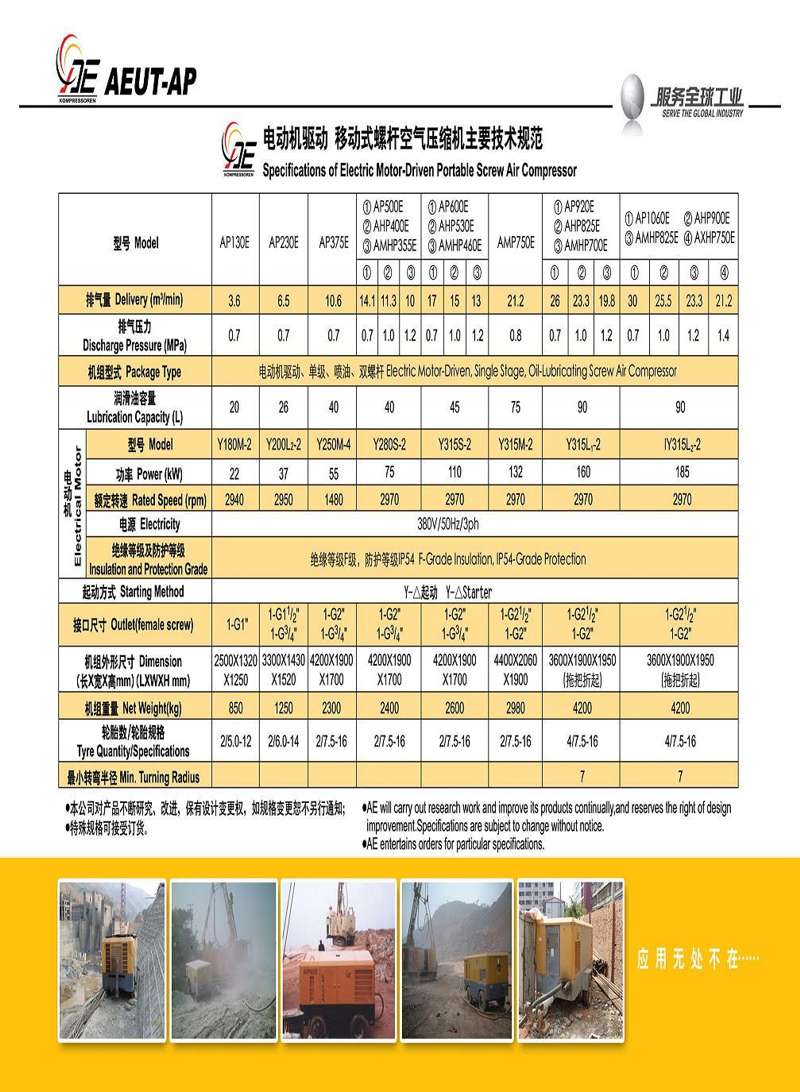 艾能机械有限公司是由香港艾能联合技术(亚太)有限公司独立投资,集空气压缩机的研究、设计开发、生产、销售于一体的专业空压机生产企业。公司成立于2004年3月,专业生产经营各种螺杆式空气压缩机、涡卷式空气压缩机,其中螺杆式空压机已研发出AEB、AED系列固定式螺杆空压机,AEBV/AEDV系列变频固定式螺杆空压机,AEP系列大中型移动式螺杆空压机,MLG(F)系列矿用移动式螺杆空压机,ETC系列无油螺杆空压机。对特种行业或特殊需求,艾能公司更擅长按照用户要求订做特殊的螺杆空压机,产品销往中国市场及出口东南亚市场。目前产品广泛应用于石化、纺织、钢铁、煤矿、水电、工程、医疗、水泥(建材)、电子、机械、汽车、食品等行业,艾能空压机在中国市场已拥有良好的品牌信誉。 艾能公司除了生产经营空压机以及售后服务外,还修理各种国内外螺杆式、涡卷式、活塞式等空压机,承接设计和安装各种空压机气站。本办事处本着以“优质为先、信益为本、真诚合作、服务第一”为宗旨,欢迎各新老客户光临惠顾,我们将竭诚为您服务。