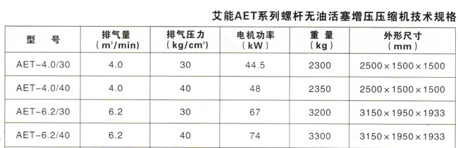 凭借雄厚的技术力量及专业的制造经验,以及精益求精的精神,艾能AET系列螺杆无油活塞增压压缩机采用三级压缩,初级压缩采用稳定可靠的艾能大转子螺杆主机,二级及三级压缩采用无油的低转速活塞气缸增压。机组冷却方式为水冷,级间采用冷冻干燥机或中间冷却器、过滤器等。整机具有无油、排气温度低、功耗低、无基础、稳定可靠、经济环保的特点。